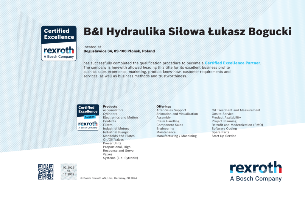 W 2025 roku osiągnęliśmy kolejny kamień milowy w naszej działalności, uzyskując status oficjalnego, certyfikowanego partnera serwisowego renomowanej firmy Bosch Rexroth. To prestiżowe wyróżnienie stanowi potwierdzenie naszych wysokich kompetencji, specjalistycznej wiedzy oraz najwyższej jakości świadczonych usług.